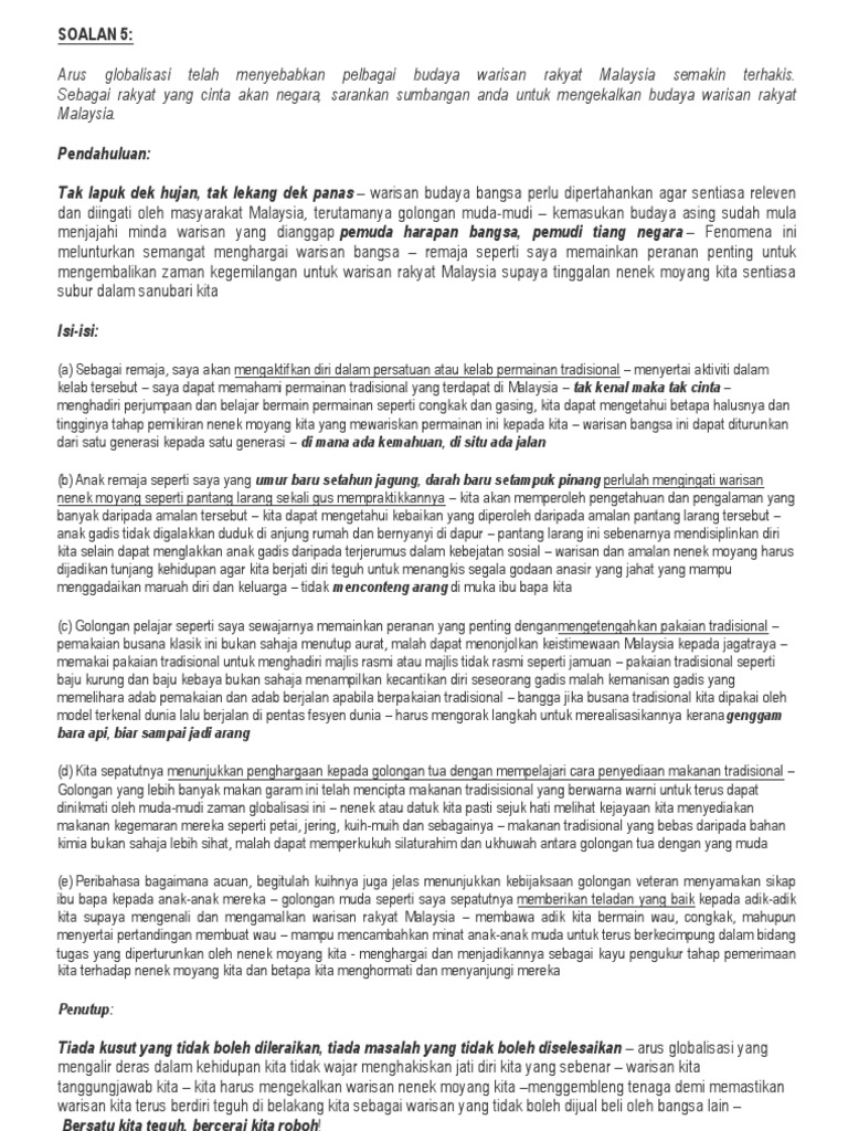 Seterusnya saya melihat kepentingan menghargai dan mengekalkan warisan bangsa ialah kesannya kepada anak-anak kecil dan remaja yang masih muda. HIMPUNAN SOALAN DANJAWAPAN KBAT SEJARAH SPM 2 ISU PERPADUAN NASIONAL PERPADUAN KEBANGSAAN GAGASAN 1 MALAYSIA Dasar British telah menyulitkan proses mewujudkan perpaduan nasional selepas negara mencapai merdeka. Tegasnya kepelbagaian kaum dan budaya adalah salah satu ciri utama masyarakat Malaysia.